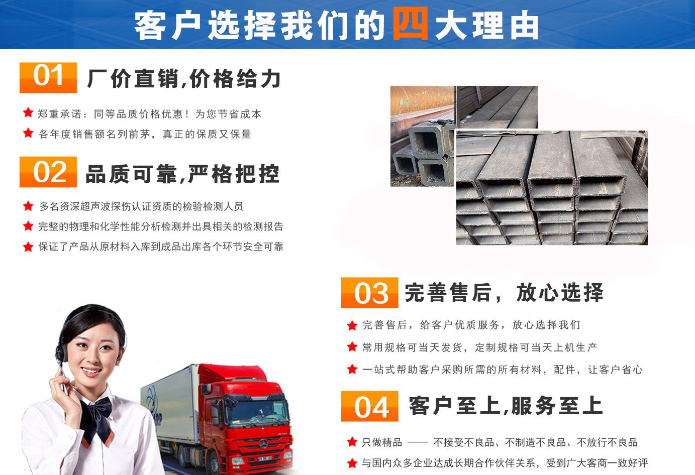 無(wú)錫盛灝特鋼有限公司長(zhǎng)期銷售Q355B方矩管,鍍鋅方矩管,大口徑方矩管,厚壁方矩管,無(wú)縫方矩管等各種方管產(chǎn)品!產(chǎn)品廣泛應(yīng)用于鋼結(jié)構(gòu)建筑(鋼管混凝土、管樁、管桁架,橋梁、海上作業(yè)平臺(tái)、港口碼頭建設(shè)、電視通訊鐵塔、電力鐵塔等鋼結(jié)構(gòu)管)。壓力管道(石油、天然氣、煤漿等輸送)、機(jī)械制輥等領(lǐng)域。 公司自創(chuàng)辦以來(lái),一直堅(jiān)持“誠(chéng)信合作,共同發(fā)展”的經(jīng)營(yíng)理念。 一直以來(lái)我們本著“以誠(chéng)相待,以信為本,互利互惠,共同發(fā)展”的長(zhǎng)期方針,充分發(fā)揮現(xiàn)貨資源優(yōu)勢(shì)為您提供“可靠的產(chǎn)品、過硬的質(zhì)量、完善的服務(wù)”,歡迎廣大新老客戶前來(lái)洽談業(yè)務(wù)。 公司以“至誠(chéng)至信,雙利雙贏”為根本宗旨,堅(jiān)持科技興企的發(fā)展策略,恪守商規(guī),創(chuàng)新進(jìn)去,贏得聲譽(yù),贏得了市場(chǎng),得到了社會(huì)各階層的認(rèn)可。公司以雄厚的實(shí)力、可靠的質(zhì)量、儲(chǔ)存鋼管門類齊全、庫(kù)存量大之優(yōu)勢(shì),本著守法、守信、創(chuàng)新的理念,打造精品,發(fā)展鋼管多元化品種,滿足客戶各種需求,以低廉的價(jià)格、熱情的服務(wù)面向國(guó)內(nèi)外客戶,歡迎鋼管界同仁加盟!我們?yōu)榭蛻籼峁┲艿降姆?wù) ! 公司為客戶提供以下服務(wù) 服務(wù)三保: 保證質(zhì)量、保證時(shí)間、保證數(shù)量。 服務(wù)宗旨: 雄厚的實(shí)力、優(yōu)質(zhì)的產(chǎn)品、低廉的價(jià)格、周到的服務(wù)。 批零兼營(yíng),一支起定。...